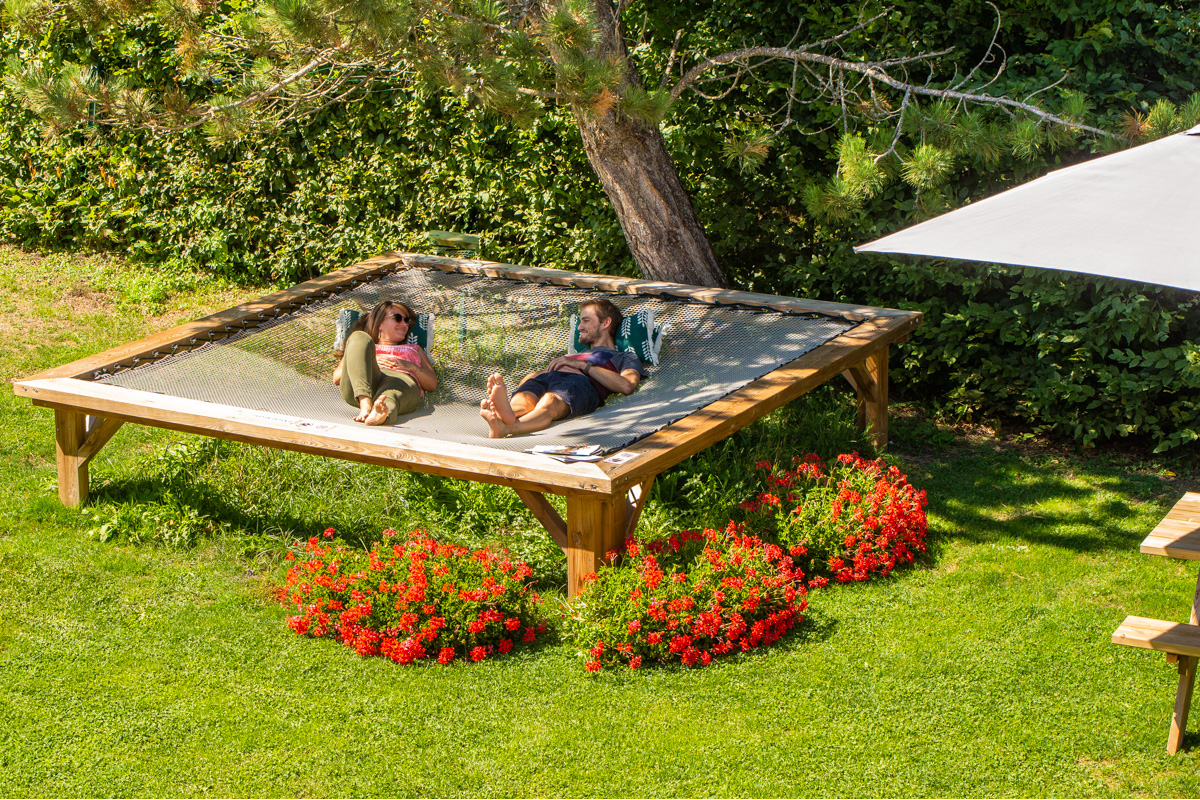 De retour à notre camp de base : relaxation musculaire dans le sauna ou repos bien mérité dans le filet de détente du jardin.
